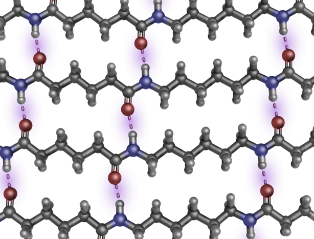 Химически нейлон — полиамид, гетероцепной полимер, в макромолекулах которого метиленовые группы (-CH2-)x регулярно чередуются с амидными группами (-CONH-). В отличие от полиолефинов межцепное взаимодействие усиливается за счет водородных связей между амидными группами соседних цепочек (см. рисунок), что обуславливает уникальные прочностные и технологические свойства полиамидов.